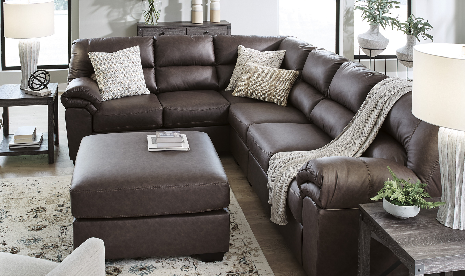 The Modern Heritage WillowBend 3-Piece Sectional Sofa brings together contemporary design and everyday comfort in a layout that works well for both relaxing and entertaining. Upholstered in a rich caramel-toned faux leather, it offers the look of genuine leather with a smooth, easy-care surface. The sectional includes a left-arm facing sofa with corner wedge, an armless chair, and a right-arm facing loveseat, creating a spacious seating arrangement with clean lines and bold jumbo stitching for added visual interest.