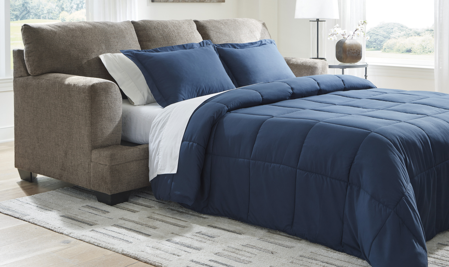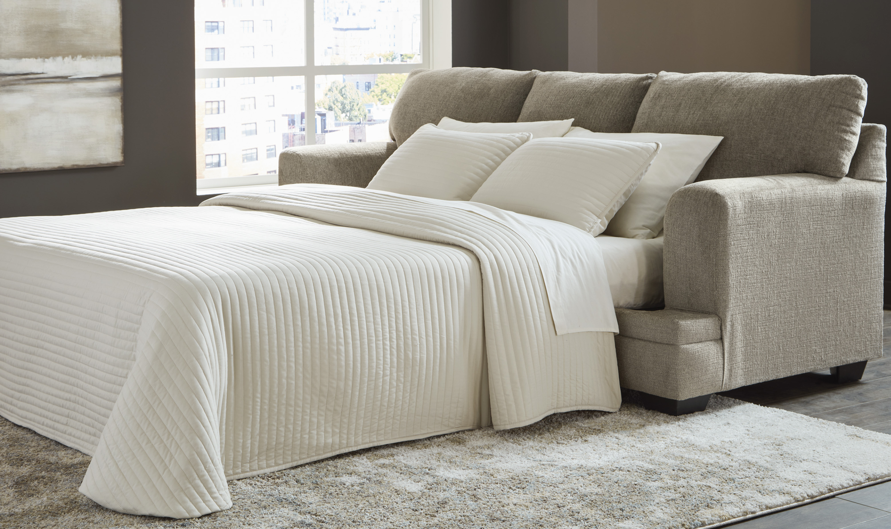 When needed, the sofa easily converts into a queen-size sleeper, making it suitable for overnight guests. A bi-fold memory foam mattress rests on a supportive steel frame, offering consistent support and improved airflow for a more comfortable sleep experience. Built with a corner-blocked solid wood frame and high-resiliency foam cushions, the Stonemeade sofa sleeper is designed for durability, comfort, and flexible use in modern living spaces.