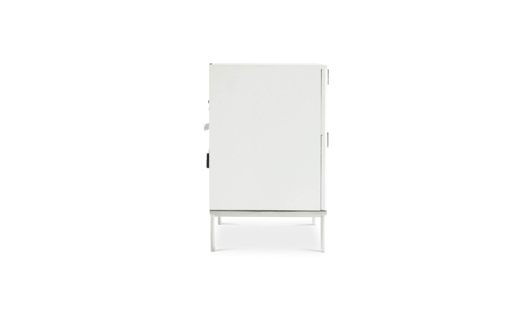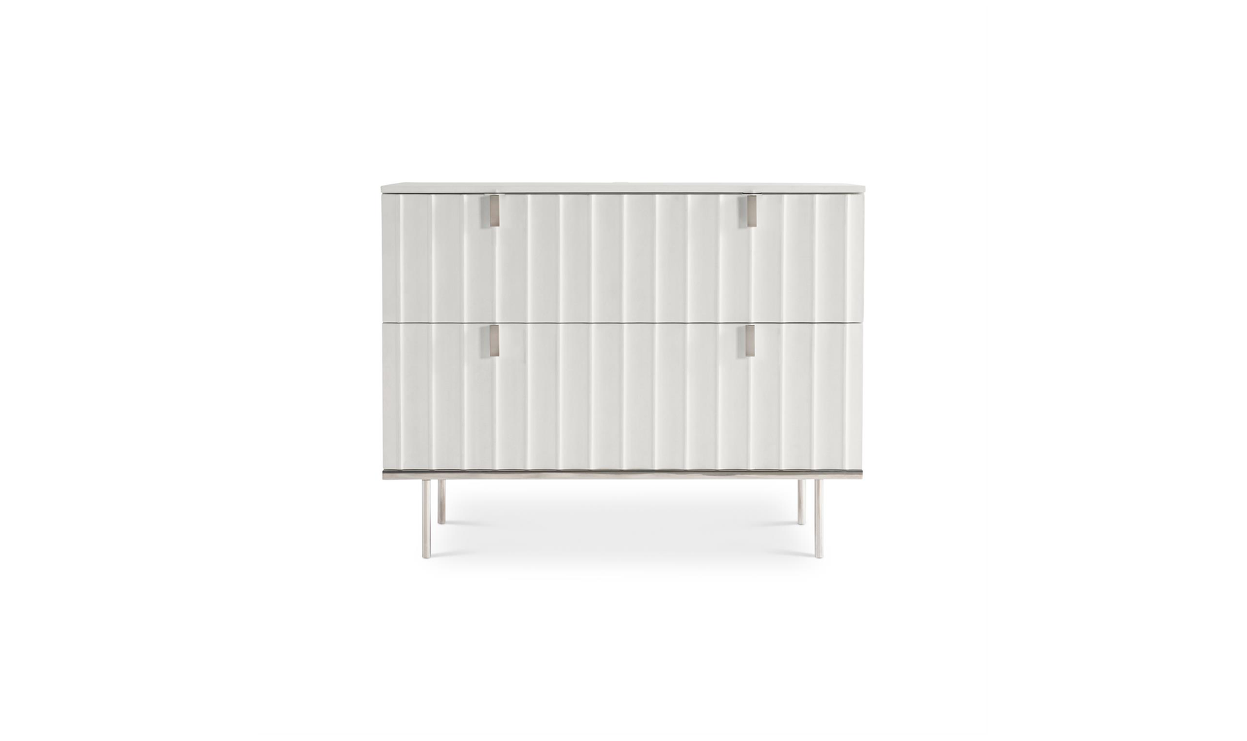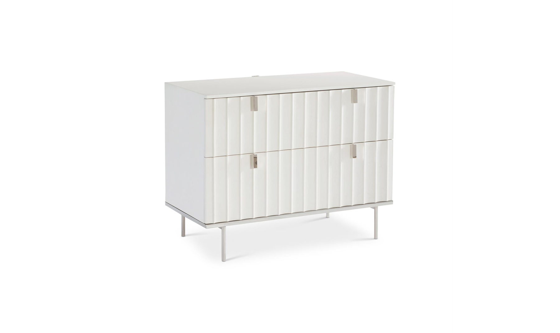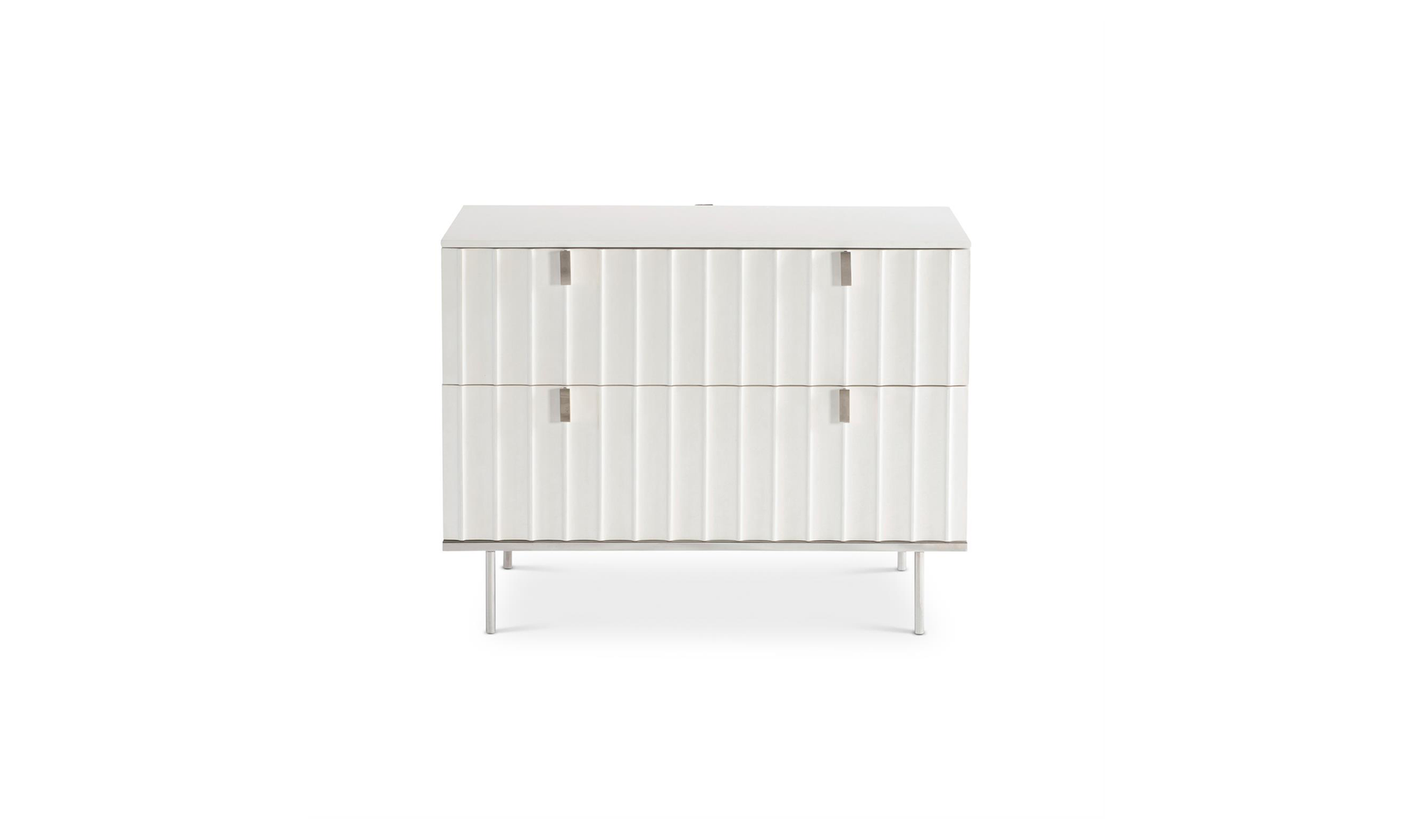 A quietly elegant design, the Modulum nightstand features cast resin fluted shaping across the two soft-close drawer fronts. Finished in a white Adobe faux stone, the case sits on a polished stainless steel base that complements the sleek door pulls. Adding function to the form, a two-port USB charger is included on the back of the nightstand.