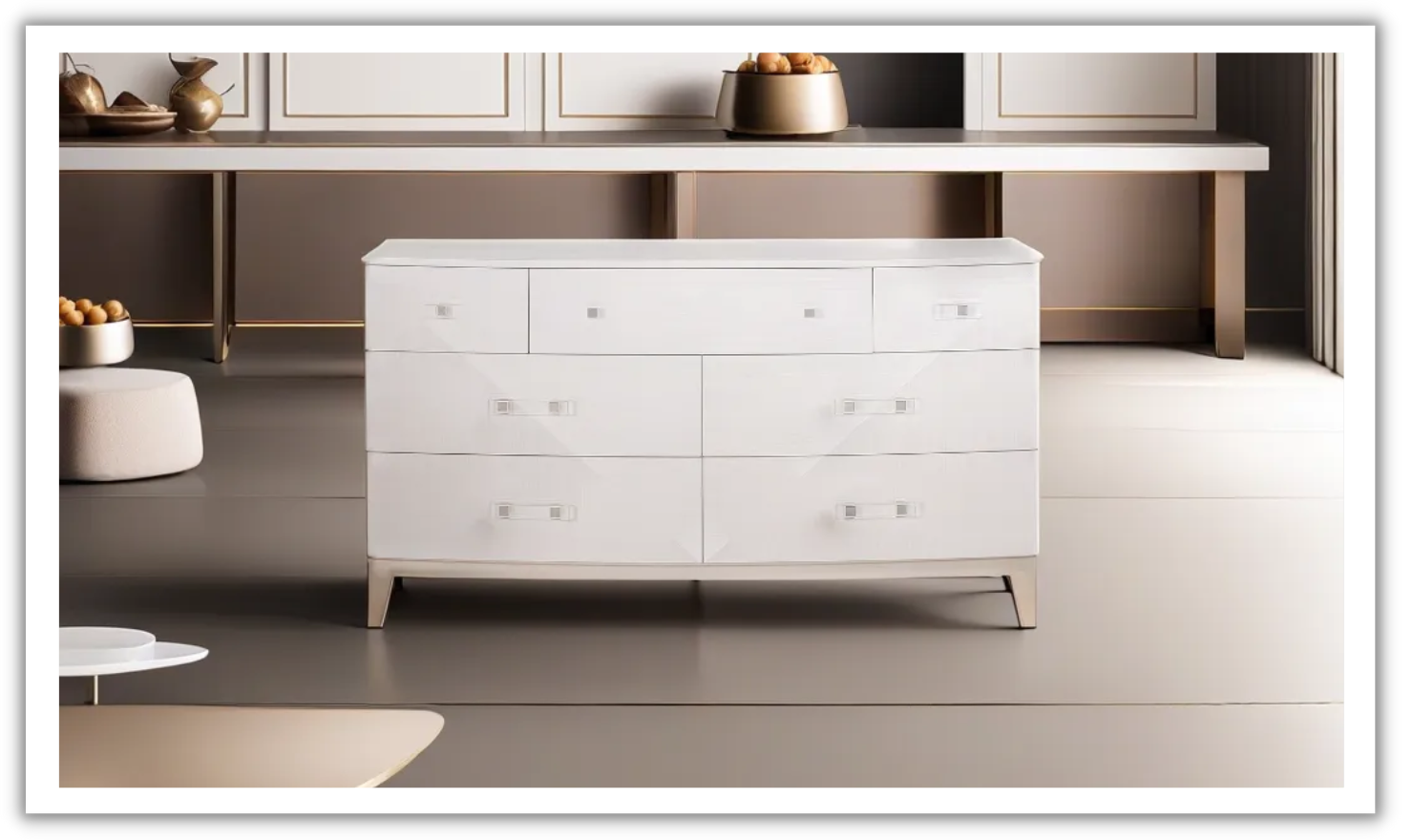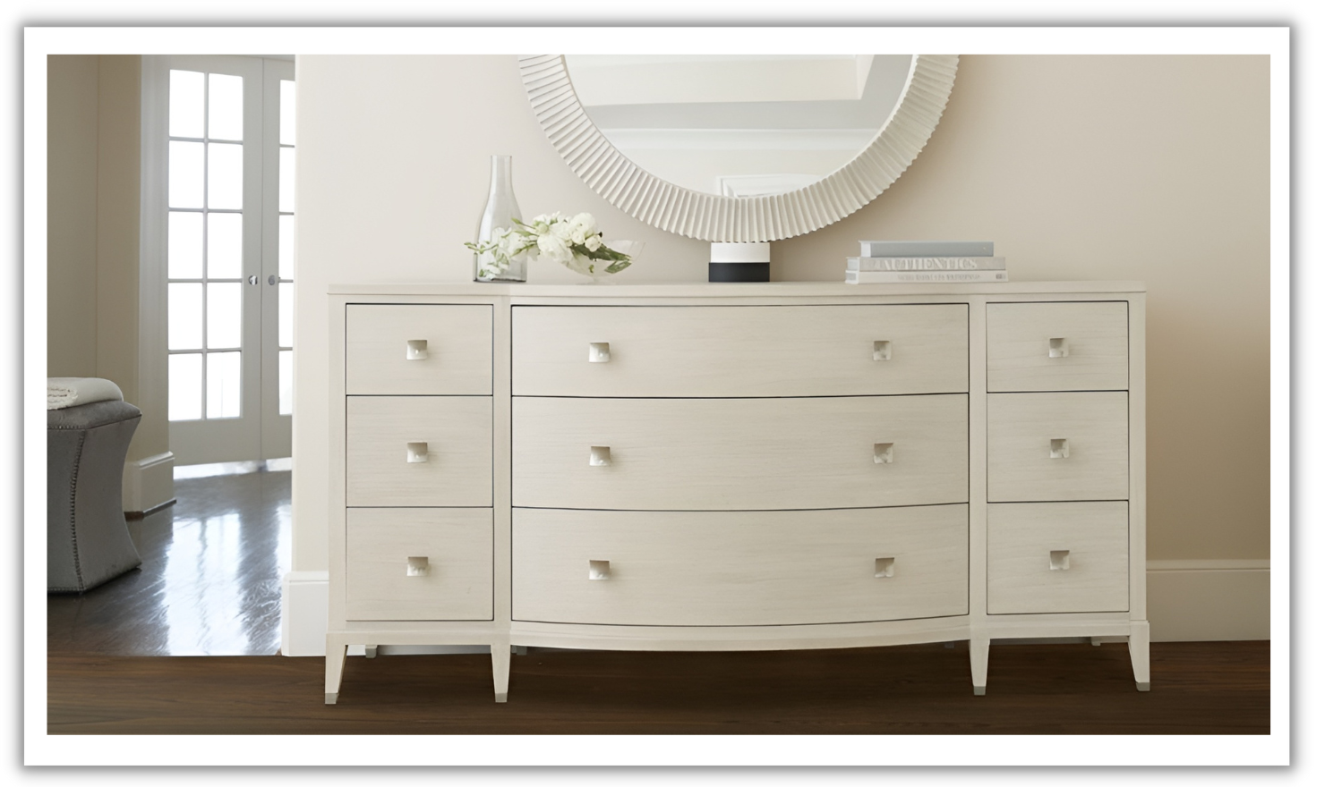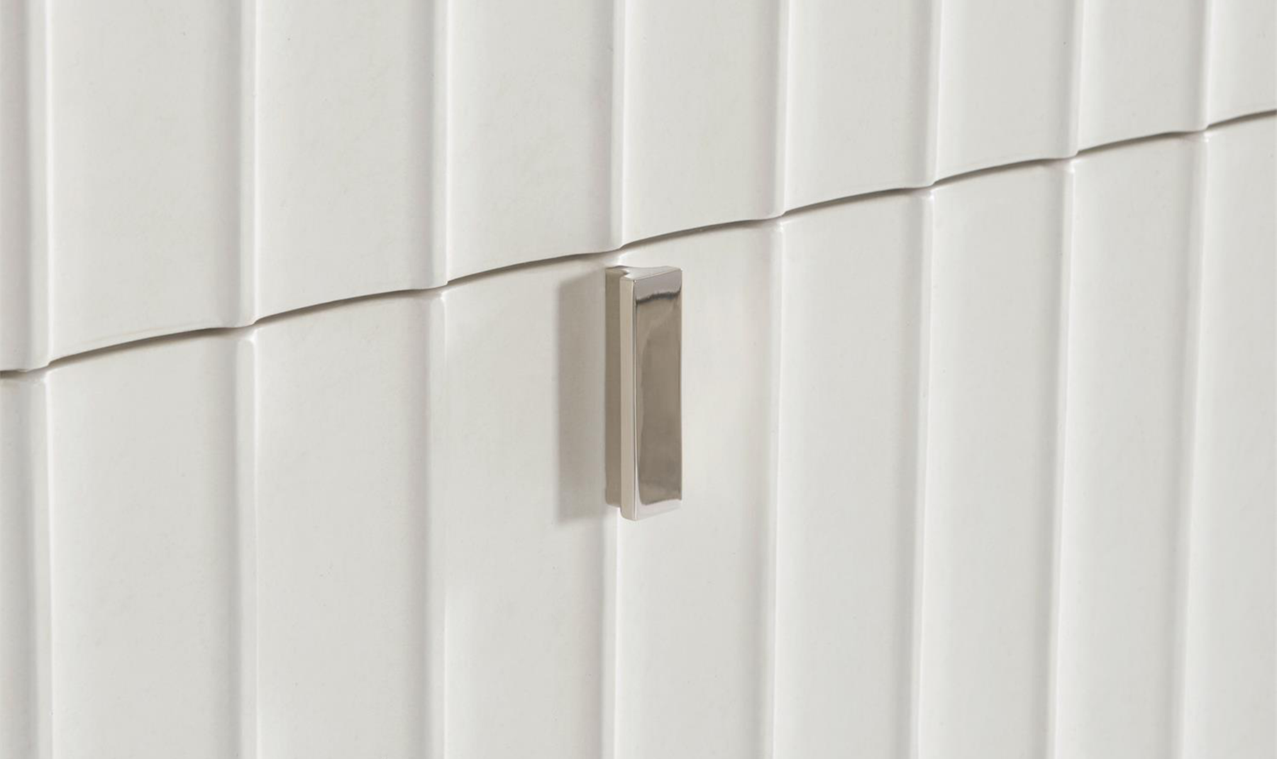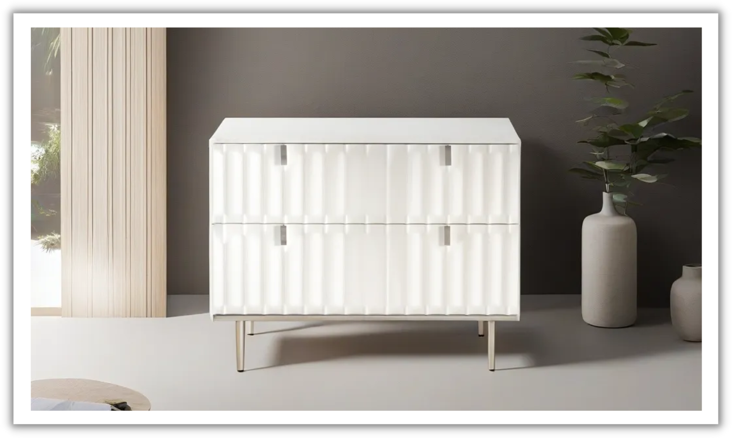 A quietly elegant design, the Modulum nightstand features cast resin fluted shaping across the two soft-close drawer fronts. Finished in a white Adobe faux stone, the case sits on a polished stainless steel base that complements the sleek door pulls. Adding function to the form, a two-port USB charger is included on the back of the nightstand.
