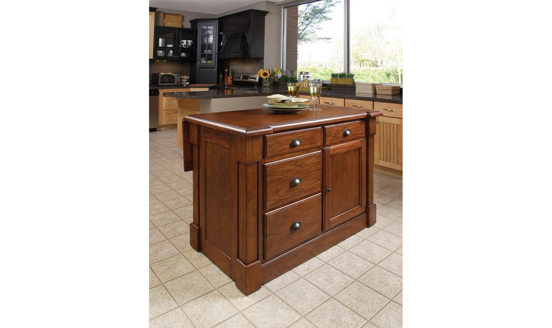 Create ambiance with a perfect balance of warmth and style with this Aspen Kitchen Island by homestyles. Solid mahogany, engineered wood, and cherry veneers are warmed with a rustic cherry finish. Recessed door panels, a profiled edge top, and bold molding detail add character. Find great storage in the four drawers and storage cabinet with adjustable shelf. There is a patented hidden sliding mechanism connected to the back two posts that provides easy mobility and expansion of the breakfast bar. Assembly required. The strength of mahogany makes it durable and the beauty stands the test of time Engineered wood offers incredible structural strength and durabilityVeneer provides the beauty and feel of natural woodgrain Adjustable shelves accommodates a variety of kitchen items.