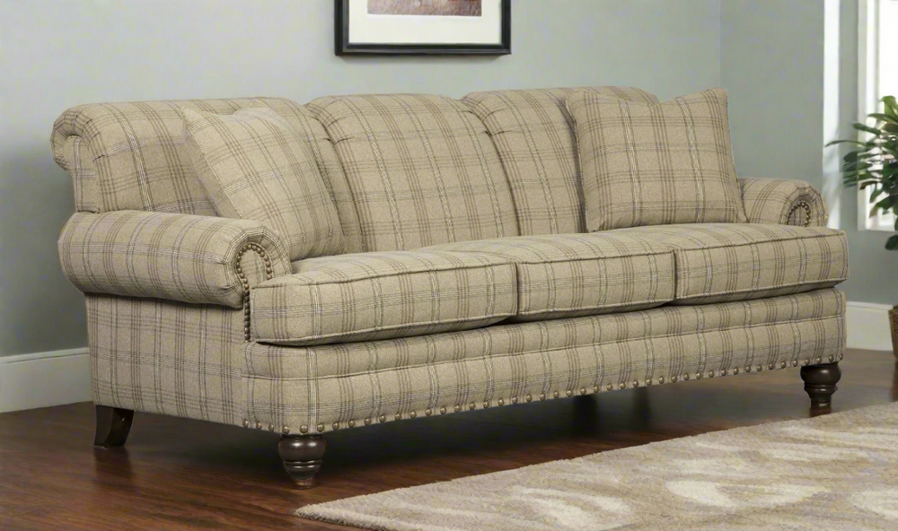 The Craftmaster Bella Fabric Sofa's classic beauty will enhance your living area. With its magnificent nail head trim embellishments, this classic three-seat sofa is sure to turn heads and bring a sense of sophistication to any decor. Both comfort and style are provided by the rolled paneled arms that are set back from the front and the soft, tight back. Its classic appeal is further enhanced by the turned legs and exquisite brass nail heads that frame the front rail and arms.