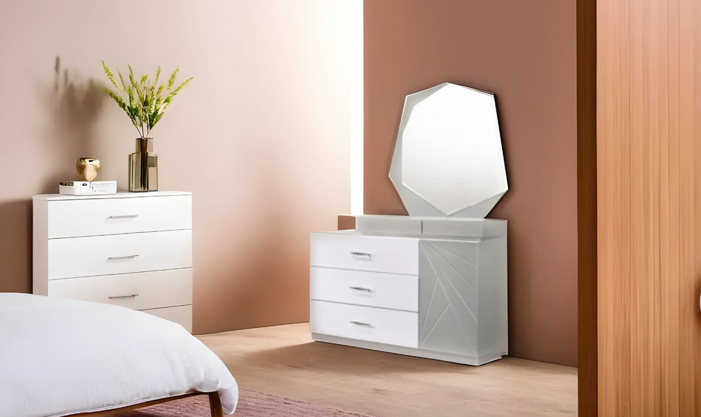 Elevate your bedroom with the Jennifer Italia Brio Dresser Set, a testament to contemporary elegance and functional design. Crafted with meticulous attention to detail, this dresser set embodies sophistication with its sleek lines and a stunning white light grey lacquer finish. Each angle is thoughtfully sculpted, enhancing the modern aesthetic while ensuring practicality and durability.