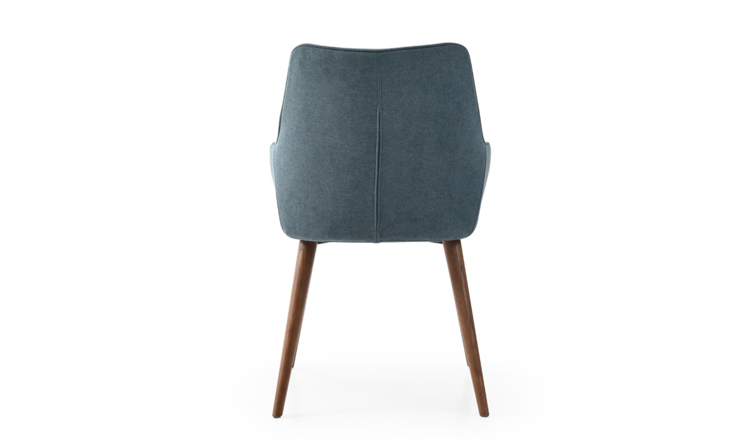 Paired with the dining table are four Linden chairs, upholstered in a plush blue fabric that brings a refreshing pop of color to the setup. Each chair offers comfortable seating with a curved backrest, making dining a relaxed and enjoyable experience. Built with quality materials, including solid wood and wood veneer, this set is crafted to last and designed to elevate the ambiance of your dining space with its chic and sophisticated style.
