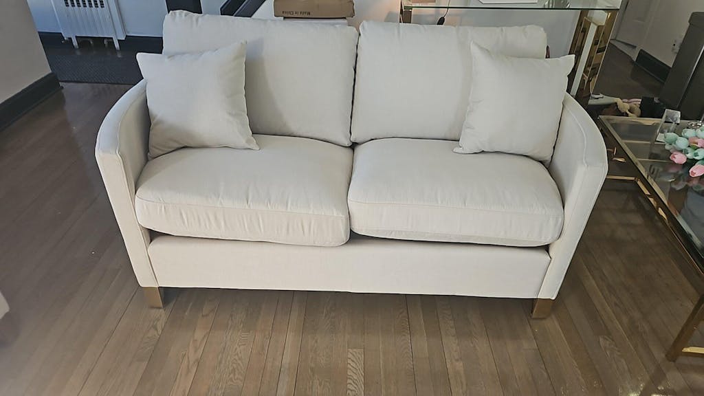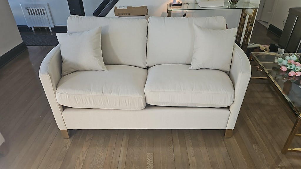 - Arched arms, lustrous accents, and elegant tones give this sofa a combination of simplicity and splendor