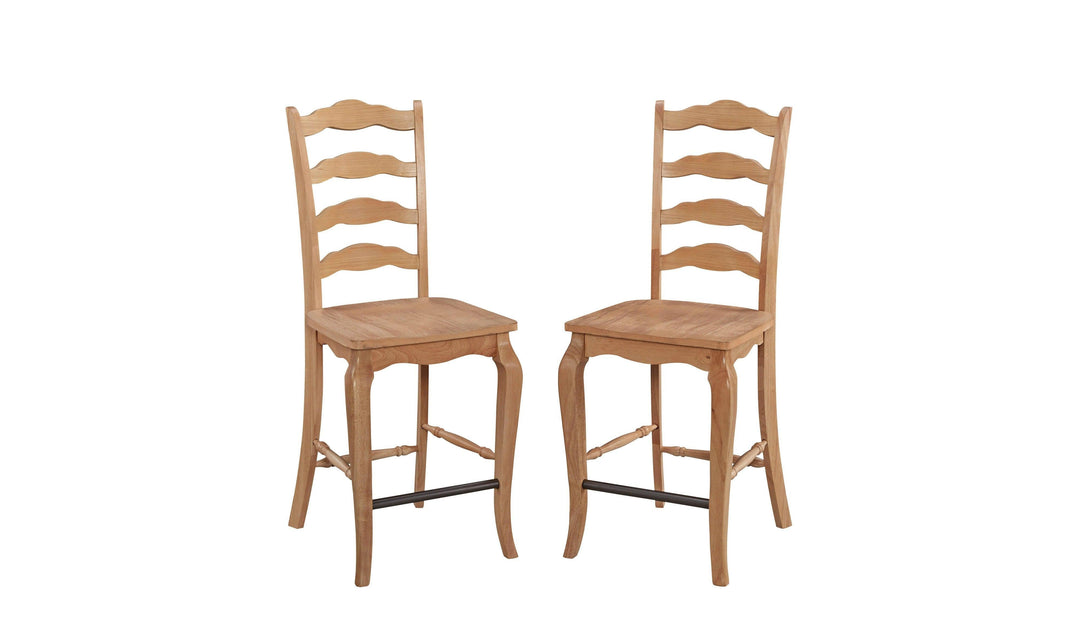 Solid pine frames defines this classic country design, utilizing multi-materials to capture the look and the feel of a rustic country item. Delivered to your door by parcel post service; meaning no waiting for lengthy truck delivery. Wire brushed pine veneer over plywood core for the steam bent back slats and molded seat, with wire brushed solid pine frames, providing a unique textured surface to all areas, and then combined with a multi-step natural honey pine finish. Classic Country French designed front cabriole legs with 4 carved slats back, and stainless steel front leg support for strength and to prevent the finish from chipping, are ideal for use with any rustic style counter. Note finish and measurements may vary slightly. Assembly required. W-18.5", D-22.25", H-46.25"