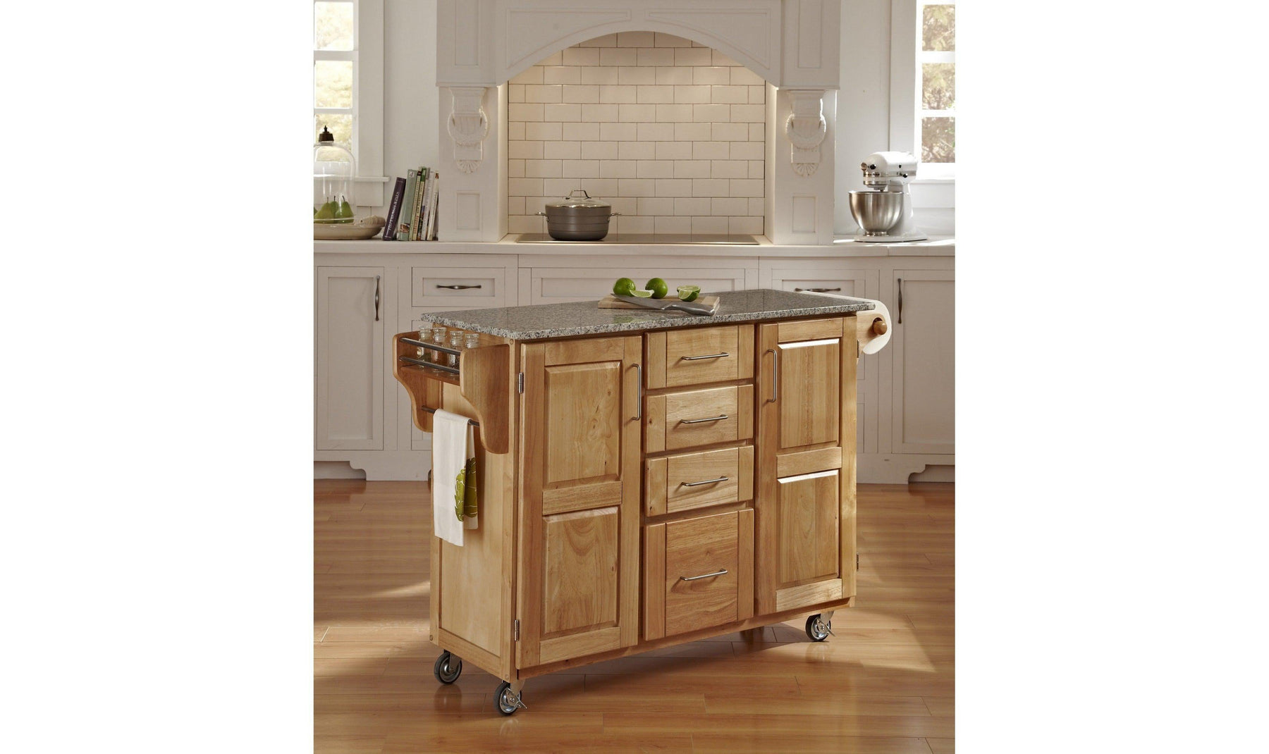 Create a stylish statement with the Create-a-Cart Kitchen Cart by homestyles. This versatile kitchen cart features a handsome natural finish and a salt-and-pepper granite surface, which is ideal for preparing and serving meals. Great for a craft room too. Constructed of premium-level, solid wood. This cart offers plenty of storage with four large, easy glide drawers and two cabinet doors with customizable shelves inside and stylish recessed panels. The cart has a towel bar on each side and a spice rack. Locking rubber casters allow portability, with two locking for stability. Comes carefully packaged with all items labeled and coordinating easy-to-follow assembly directions. Constructed of premium-level, solid wood Natural finish with salt-and-pepper granite topFour large, easy glide drawers and two cabinet doors with customizable shelves inside Towel bar on each side and a spice rack.