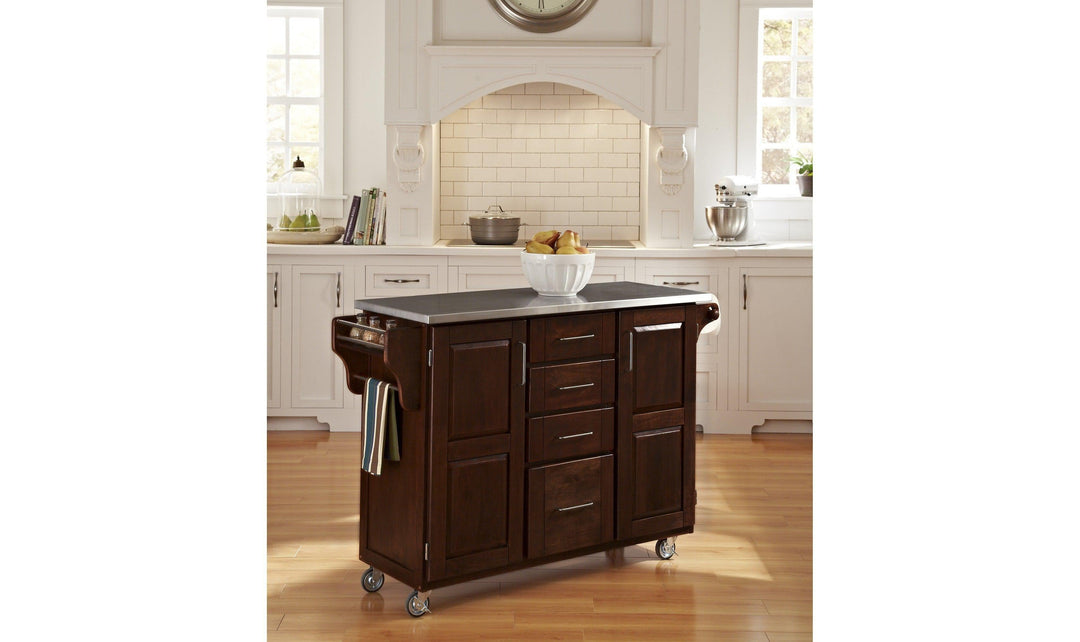 Create a stylish statement with the Create-a-Cart Kitchen Cart by homestyles. This versatile kitchen cart features a handsome cherry finish and an 0.8 mm stainless steel surface with a protective coating, which is ideal for preparing and serving meals. Great for a craft room too. Constructed of premium-level, solid wood. This cart offers plenty of storage with four large, easy glide drawers and two cabinet doors with customizable shelves inside and stylish recessed panels. The cart has a towel bar on each side and a spice rack. Locking rubber casters allow portability, with two locking for stability. Comes carefully packaged with all items labeled and coordinating easy-to-follow assembly directions. Hardwood is incredibly strong, easy to clean and maintains its beauty for ages Maximize valuable kitchen storage space with four drawersAdjustable shelves to accommodate pots, pans and small appliances High quality easy-glide drawers open and close smoothly.