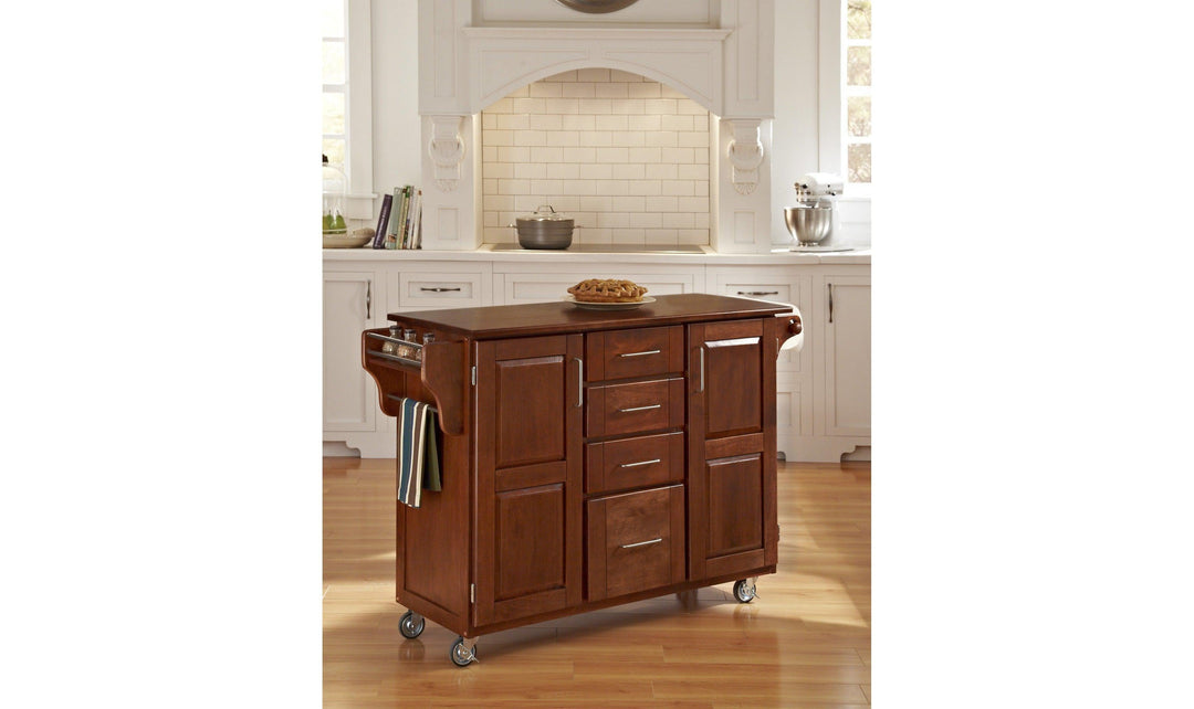 Create a stylish statement with the Create-a-Cart Kitchen Cart by homestyles. This versatile kitchen cart features a handsome warm oak finish and a.75" cherry-finished wood surface with protective coating, which is ideal for preparing and serving meals. Great for a craft room too. Constructed of premium-level, solid wood. This cart offers plenty of storage with four large, easy glide drawers and two cabinet doors with customizable shelves inside and stylish recessed panels. The cart has a towel bar on each side and a spice rack. Locking rubber casters allow portability, with two locking for stability. Comes carefully packaged with all items labeled and coordinating easy-to-follow assembly directions. Hardwood is incredibly strong, easy to clean and maintains its beauty for ages Maximize valuable kitchen storage space with four drawersAdjustable shelves to accommodate pots, pans and small appliances High quality easy-glide drawers open and close smoothly.