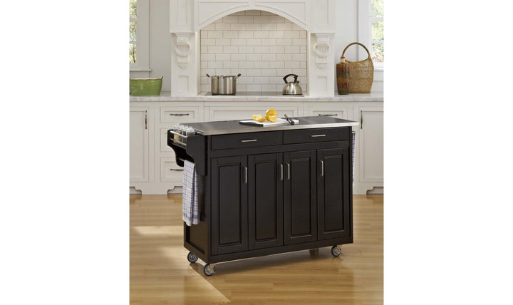 Create cabinet and counter space in an instant with the large Create-A-Cart Kitchen Cart by homestyles. This portable kitchen cart is constructed of solid sustainable hardwood with a durable veneer back and drawers. It has a beautiful black finish with a non-toxic clear-coat and a stainless steel top. Features three large storage cabinets behind four paneled doors, each with adjustable shelving and stainless steel handles. Two spacious drawers fitted with easy-glide metal rails for soft opening and closing. Built-in spice rack, stainless steel towel bar and paper towel holder. Cart is mounted on industrial-strength casters (two locking). Comes carefully packaged with all items labeled and easy-to-follow assembly directions. Sustainable hardwood harvested using earth-friendly measures Veneer provides the beauty and feel of natural woodgrainAdjustable shelves to accommodate pots, pans and small appliances Drawers maximize valuable kitchen storage space.
