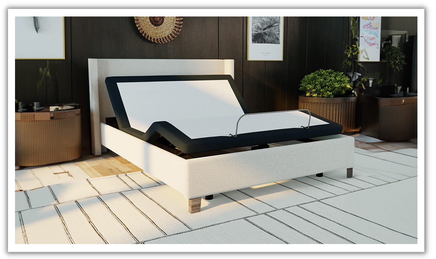 Introducing the Alex Adjustable Base with Headboard, a stylish and functional addition to elevate your bedroom experience. This adjustable base is designed with six legs in a mid-century modern style, featuring a wood-like pattern for added aesthetics. The customizable leg heights provide a tailored look while maintaining stability.