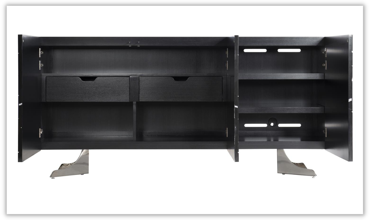 The right door opens to two adjustable/removable shelves with vents and a covered grommet hole in the back panel, offering versatile storage options. The buffet stands on two Polished Stainless Steel angled feet with adjustable glides for stability. For added safety, the buffet includes an anti-tip kit and instruction sheet.[endDescription][Specifications]