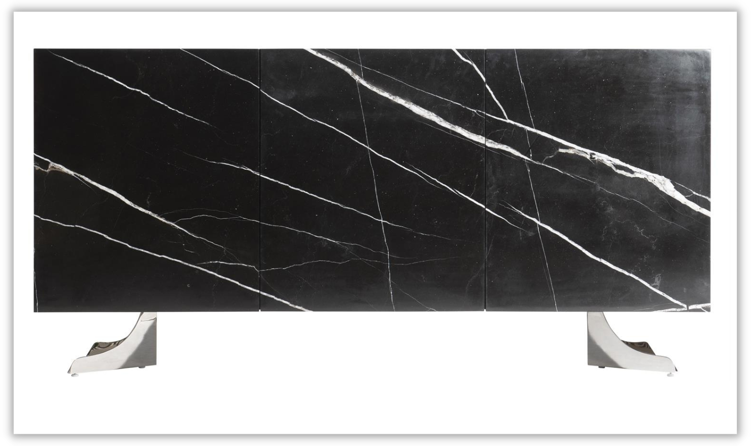 Introducing the Imani 2 Drawer Buffet, a striking fusion of dramatic style and functional design. The buffet features Nero Marquina laminated stone overlays on three push-to-open doors, creating a captivating visual impact. The polished and angled stainless steel feet provide a stunning contrast, elevating the overall aesthetic.