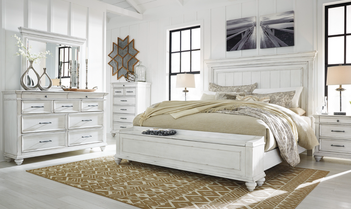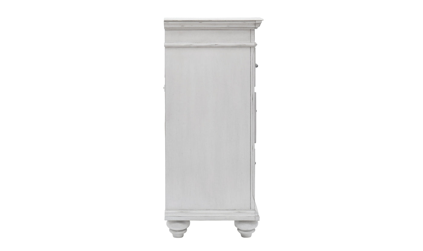 Give your retreat vintage charm with this 7-drawer chest. Sporting a beautifully distressed whitewashed finish, it includes seven varied-sized drawers for an organized wardrobe. Generously scaled moulding from top to bottom, along with bun feet and drawer handles with a transitional aesthetic, give this chest character—invoking the feel of a quaint cottage escape.