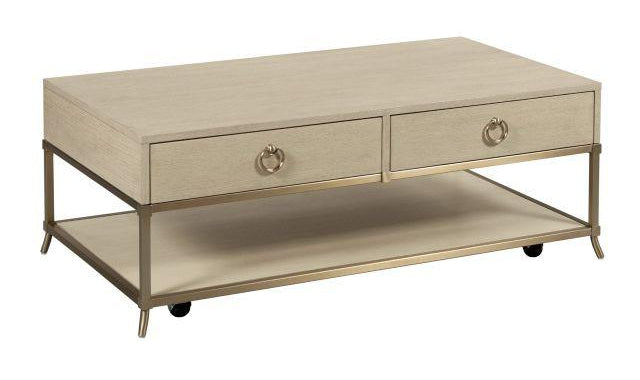 The Westgate Coffee table features two drawers, one fixed shelf and casters. ALABASTER(OAK VENEER); RICH CLEAR LAQUER(AMARA EBONY VENEER); BRASSY CHAMPAGNE(METAL)