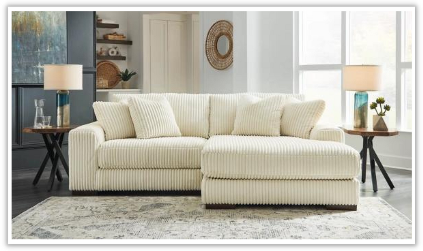 . This sectional exudes a perfect blend of plushness and posh aesthetics, making it a striking focal point in any modern home. Crafted with meticulous attention to detail, the sectional's standout feature is its captivating cord upholstery that is undeniably on-trend.