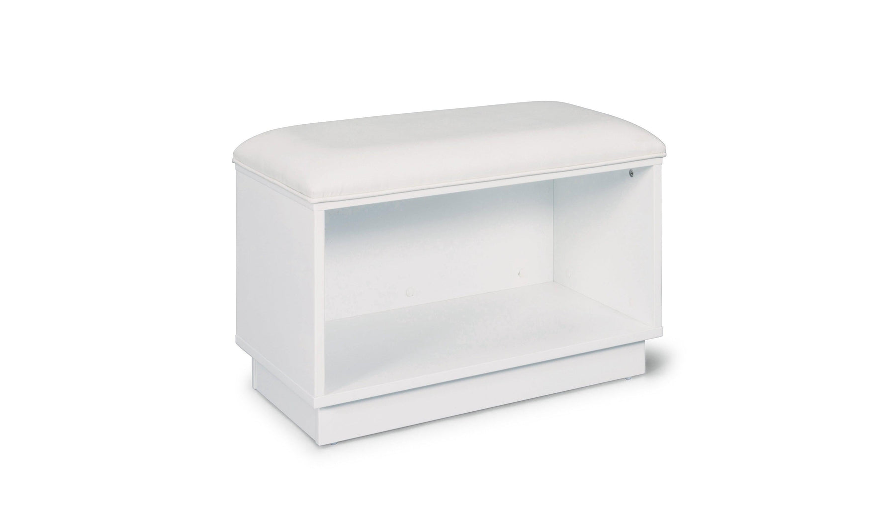 Practical in purpose, yet stylish in design. The Linear Storage Bench by homestyles lets you store even more essentials in the mudroom, entry way, or living room. Constructed of poplar solids and engineered wood in a high-gloss, polyurethane white finish. The interior has a melamine finish for lasting durability. The bench features a padded upholstered, white vinyl-covered top with welt edge trim. The bench's plinth base adds to the European appeal. Comes carefully packaged with all items labeled and coordinating easy-to-follow assembly directions. Measures 19"H x 28"W x 15"D.