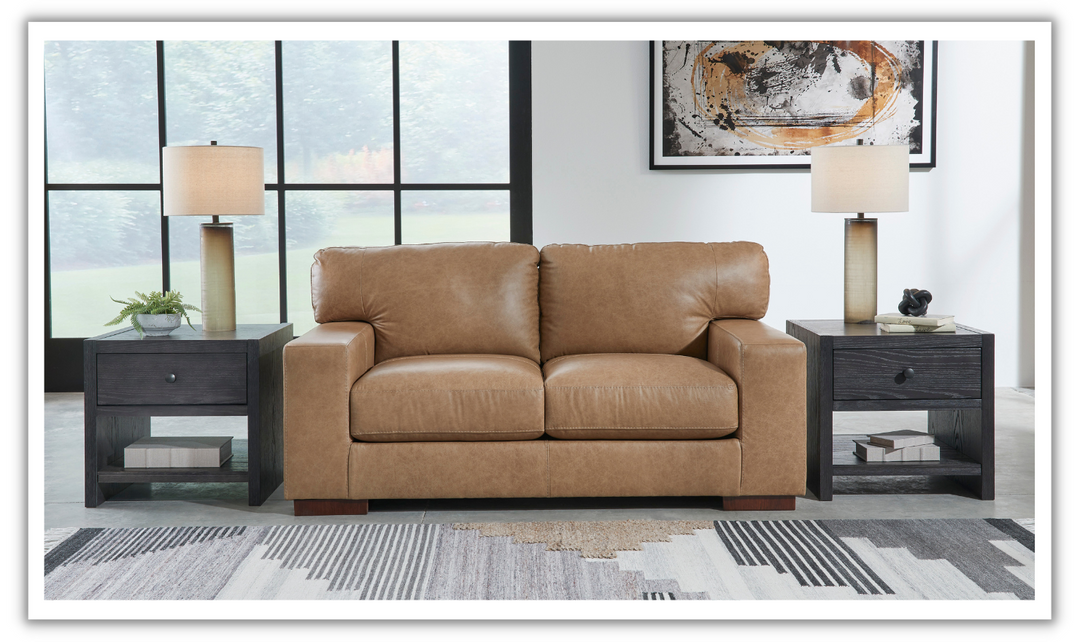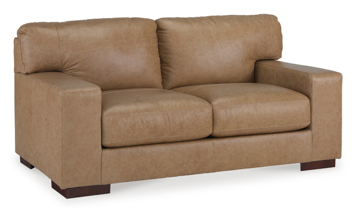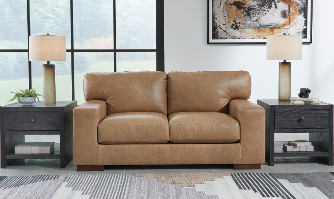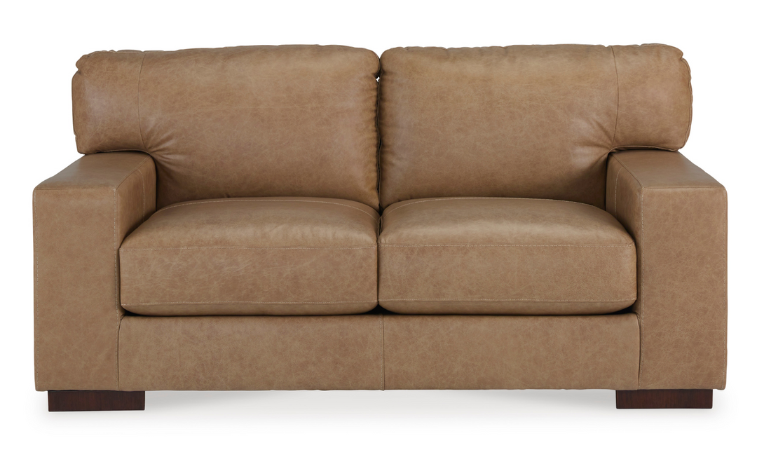 Premium in every aspect, this Lombardia brown leather loveseat with track arms is crafted with elevated comfort in mind. Every detail, including the supple combination of leather and faux leather upholstery, has been designed and refined to look and feel luxurious. Whether you use it as an inviting place to lounge or pair it with the matching sofa and accent chair, it's sure to be a rich addition to your home.