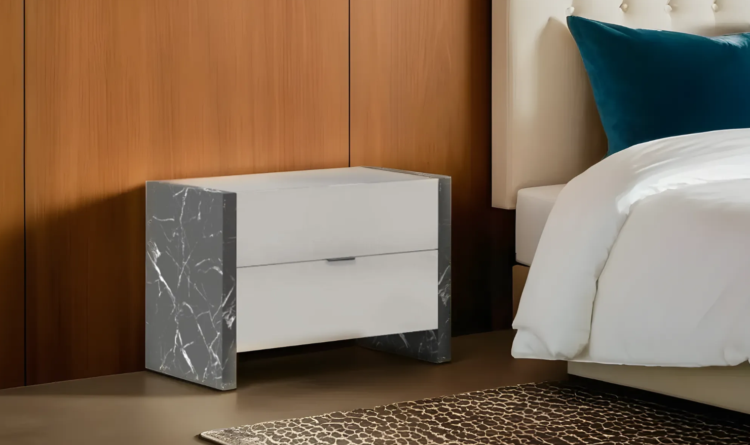 The Jennifer Italia Mah Jong 2-Drawer Nightstand in Gray offers a perfect blend of sophistication and functionality. Designed with meticulous attention to detail, this nightstand features two spacious drawers, each equipped with high-quality, soft-close undermount slides. These premium slides include a stop safety feature to prevent full extraction, ensuring a smooth, secure, and luxurious drawer operation every time. The effortless glide and firm closure of the drawers exude elegance and refinement, adding a touch of luxury to your bedroom decor.