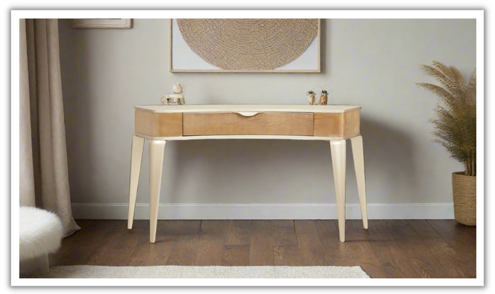 Designed for both grooming routines and focused work, the desk includes a velvet-lined drawer with smooth self-closing glides to keep essentials organized and protected. A painted Chardonnay detail on the desktop adds visual interest, while a built-in wireless charging surface keeps your phone powered without cluttering the space. Whether used as a vanity or as a writing desk, it offers a balanced mix of comfort, style, and everyday usability.