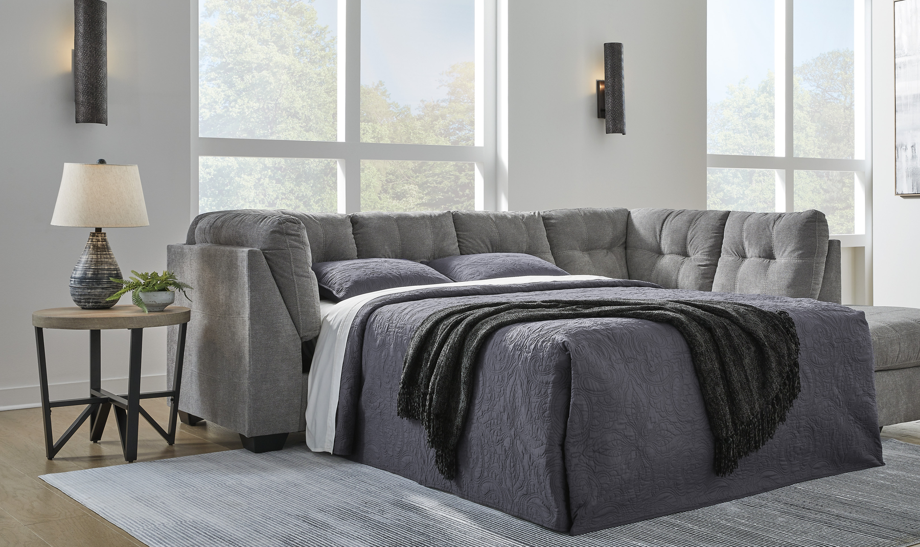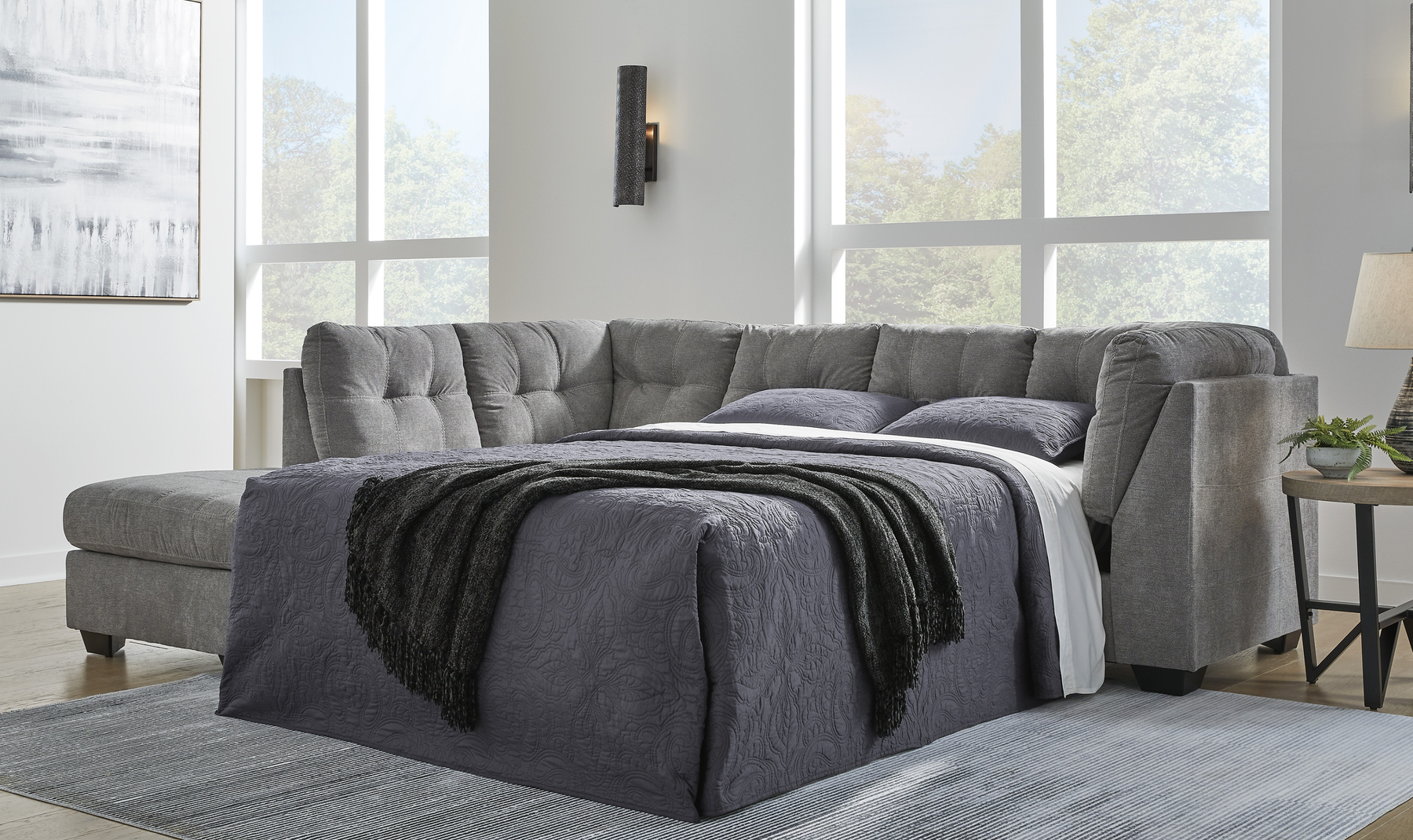 Experience the perfect blend of style and comfort with the Marleton 2-Piece Sleeper Sectional with Chaise. Upholstered in a denim-inspired fabric, this sectional offers a timeless aesthetic that complements any decor. Its contemporary silhouette, accented by stitched detailing, provides a modern touch that keeps your living space on trend.