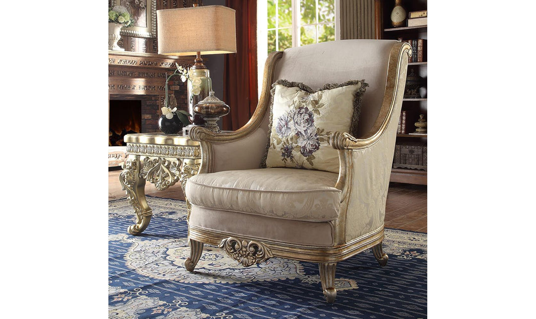 Traditional Metallic Bright Gold Finish Chair. Introduces the brilliance of time-honored style merged with Classic European, right into the center of your home. This collection is upholstered with Rich European Luxury Fabric and wood trim all around in metallic bright gold finish, Chair is complimented by stylish accent pillow included as shown. Lavish and Breath taking is what most describes this Chair. Seductively Cedar crafted to enjoy the artistic layout, with a combination of chenille fabrics and silky textiles. Matching to its rich and satin feel are the included dazzling Pillows.