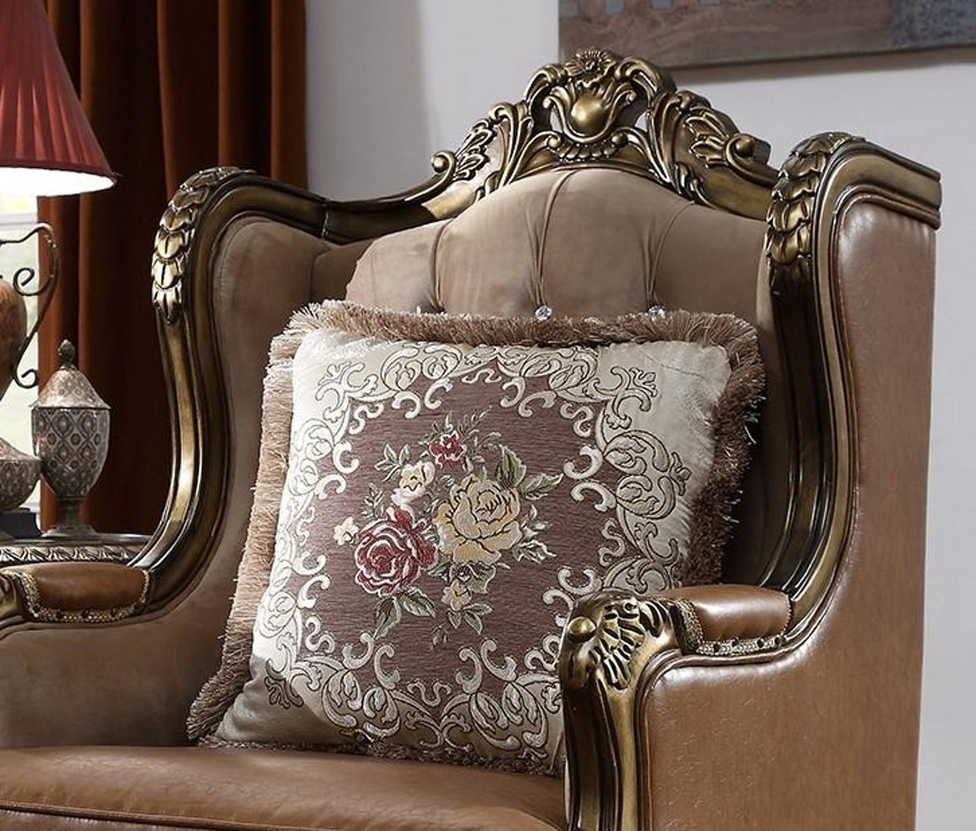 Introduces the brilliance of time-honored style merged with Classic European, right into the center of your home. This collection is upholstered with Rich European Luxury Leather and wood trim all around in Mohawk Finish, Chair is complimented by stylish accent pillow included as shown. Lavish and Breath taking is what most describes this Chair. Seductively Cedar crafted to enjoy the artistic layout, with a combination of luxury leather. Matching to its rich and satin feel are the included dazzling Pillows.