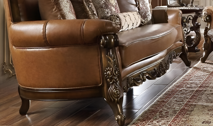 Introduces the brilliance of time-honored style merged with Classic European, right into the center of your home. This collection is upholstered with Rich European Luxury Leather and wood trim all around in Mohawk Finish, Sofa set is complimented by stylish accent pillow included as shown. Lavish and Breath taking is what most describes this Sofa set. Seductively Cedar crafted to enjoy the artistic layout, with a combination of luxury leather. Matching to its rich and satin feel are the included dazzling Pillows.