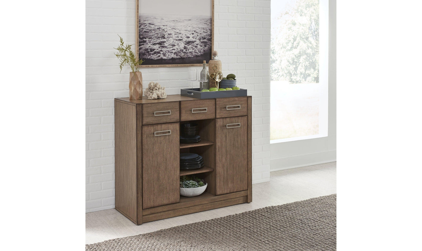 California contemporary design with a slightly weathered driftwood, natural brown oak finish. The Big Sur Buffet by Homestyles is crafted from ash hardwood solids and straight-grain oak veneers over engineered wood. Solid wood surfaces have a wire-brushed texture, providing a weathered look. Three upper utility drawers. Two doors with soft-close European hinges open to a storage area with two adjustable shelves in each. The center open storage area also features two adjustable shelves. Doors and drawers feature unique open-handle pulls in a brushed nickel finish. Finish and measurements may vary slightly. Arrives at your door by parcel delivery service. Assembly required.