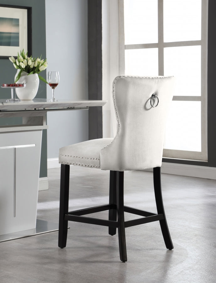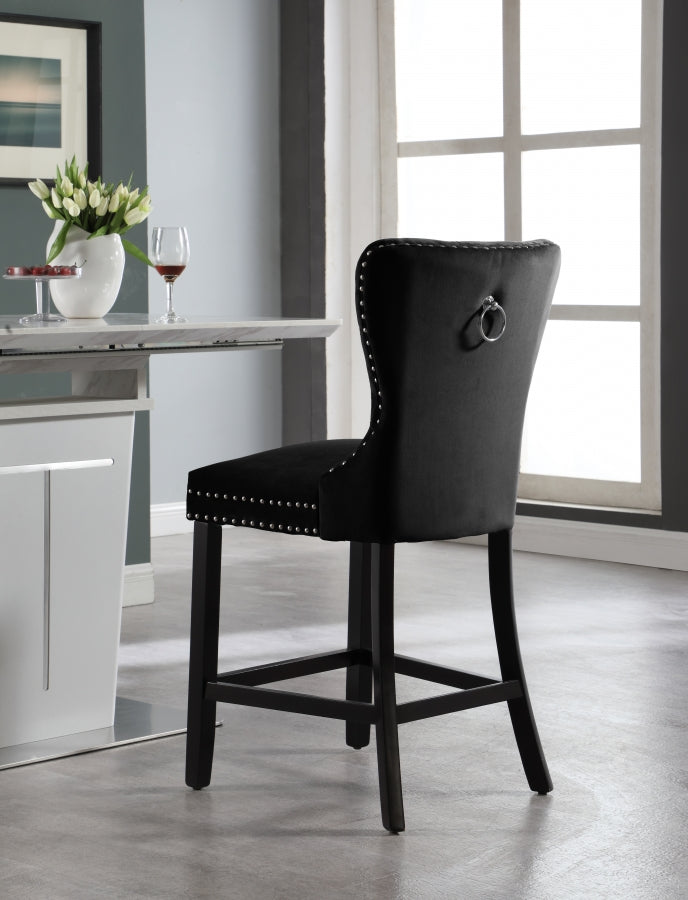 [Description]Lounge in luxurious style with the Nikki velvet counter stool. Featuring a curved high back, plush cushioned seat and deep tufted navy velvet upholstery studded with chrome nailheads, this counter stool is sure to take your dining experience to a whole new level. Espresso wood legs provide sturdy support and complement the stunning navy upholstery for a sleek, contemporary design. [endDescription] [Specifications]