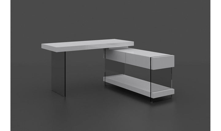 Finished in a sophisticated white gloss and featuring thick, resilient tempered glass legs, this desk exudes a chic, modern aesthetic. Its innovative design allows the desktop to swivel 360 degrees, offering unparalleled convenience and adaptability.