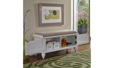The Penelope collection is inspired by the fusion of British traditional and old world tropical design. Highlights include solid poplar in a white hand-applied visible brushed stroke finish, as well as shutter style design and turned feet. It includes two doors that lead to storage, a removable and reversible ultra-suede cushion, and antiqued brass hardware. Finish and measurement may vary slightly. Size: 47.25"W x 18"D x 21"H.