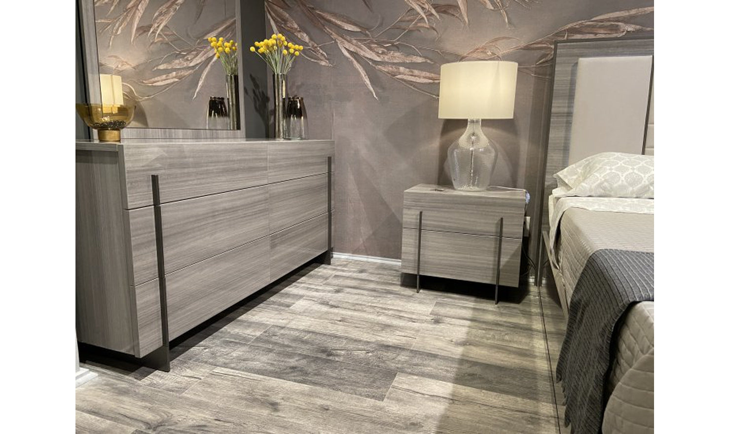 The Rosace Bedroom Collection showcases an innovative and luxurious design created by the metal “Rosace” that start underneath the case goods and extend to the front to serve as handle for the drawers. The design is replicated on the headboard where two metal bars sink into a velvety upholstered panel. Hidden behind the edges of the panel there is a stripe of led lights that serve as courtesy lights operated by invisible switches located on each side of the headboard. These panels feature eucalyptus grain black stripes over a grey color with a glossy finish. This sophisticated modern-industrial design is a great addition to the furnishing of your house. All drawers are equipped with high-quality, soft, self-closing, undermount slides with stop safety feature to prevent a full extraction. The smooth and firm opening and closing movement of the drawers convey a sense of luxury. Drawers are completely lined with fabric-like material that is scratch and stain resistant. Bed sides and footboard are assembled with cam-lock hardware that guarantee precision and sturdiness.