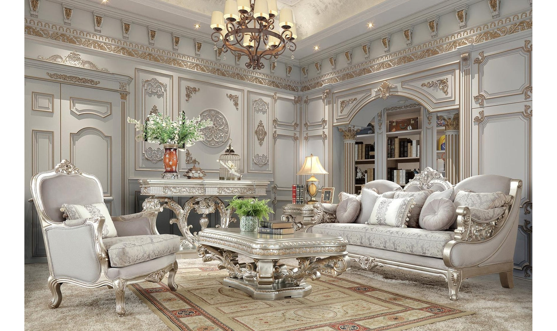 Introduces the brilliance of time-honored style merged with Classic European, right into the center of your home. This collection is upholstered with Rich European Luxury Fabric and wood trim all around in Metallic Silver finish, Loveseat is complimented by stylish accent pillow included as shown. Lavish and Breath taking is what most describes this Loveseat. Seductively Cedar crafted to enjoy the artistic layout, with a combination of chenille fabrics and silky textiles. Matching to its rich and satin feel are the included dazzling Pillows.