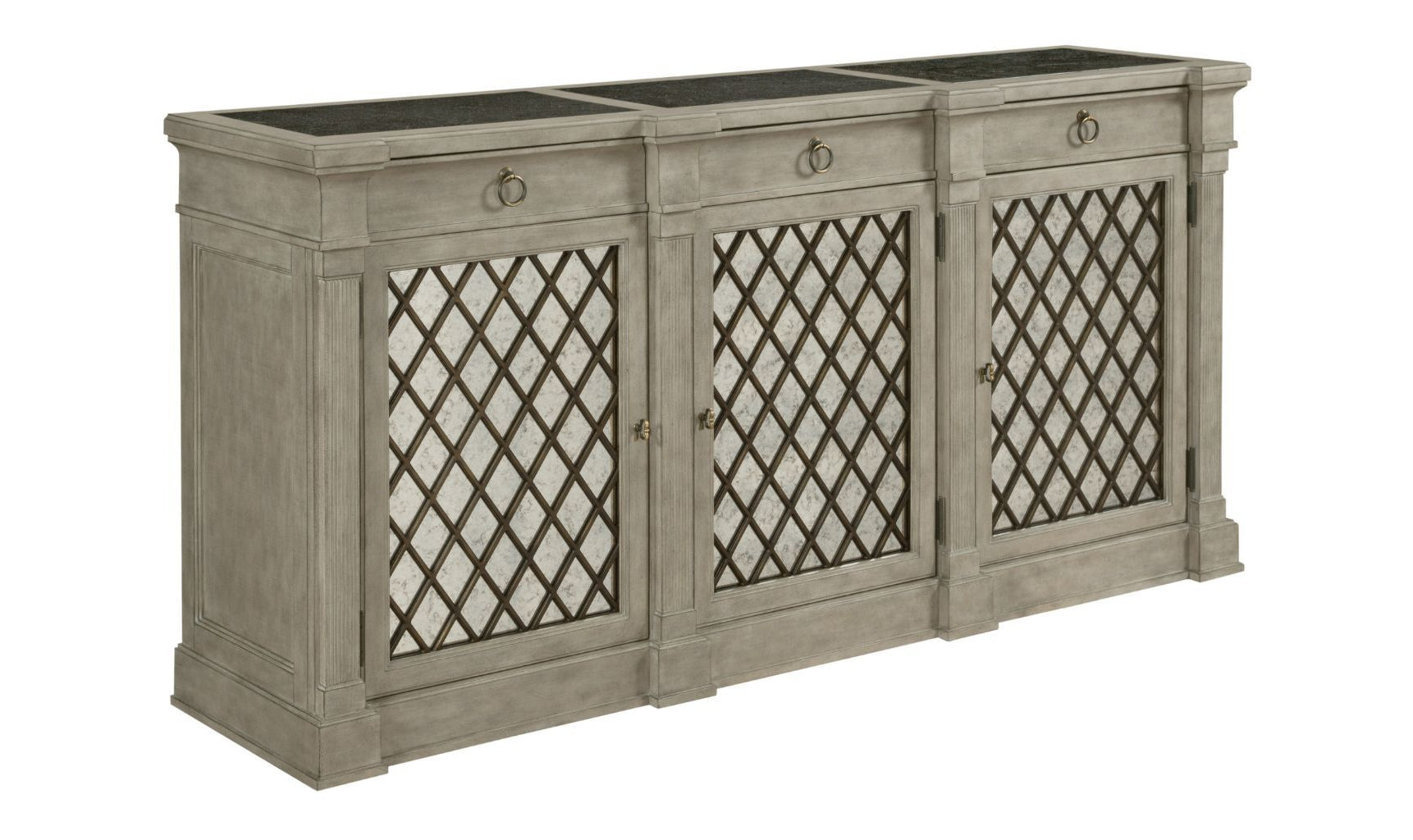 Colette credenza is exquisite with the moulded fretwork pattern in the doors and a great serving piece with the inset bluestone top. Lot's of storage with three doors, three drawers and two adjustable wood shelves behind each door. Complete your setting with this spectacular piece. Versaille
