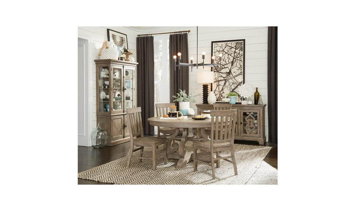 Gustavian influenced Tinley Park Dining Room creates charming ambiance in a soft Dove tail Gray finish. Set the perfect place setting at one of two round dining table sizes that features weathered pine solid tops resting atop open scrollwork bases or select the larger rectangular double pedestal carved scroll base table with two butterfly leaves and a handsome weathered bronze metal stretcher. The same gorgeous base and stretcher are featured on a hardworking counter table which can be paired with the slat back counter chair for multi-purpose dining, prepwork and entertaining.
