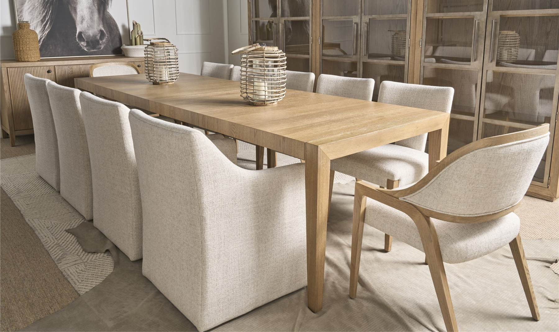 Designed with flexibility in mind, the Volpi Dining Table includes two 24-inch extension leaves, allowing it to expand up to 120 inches in length. This makes it well-suited for both everyday meals and larger gatherings. The table also features discreet adjustable levelers that keep it stable on uneven floors, making it practical as well as stylish. Whether used for casual dinners or hosting guests, the Volpi balances function with a quietly refined aesthetic.