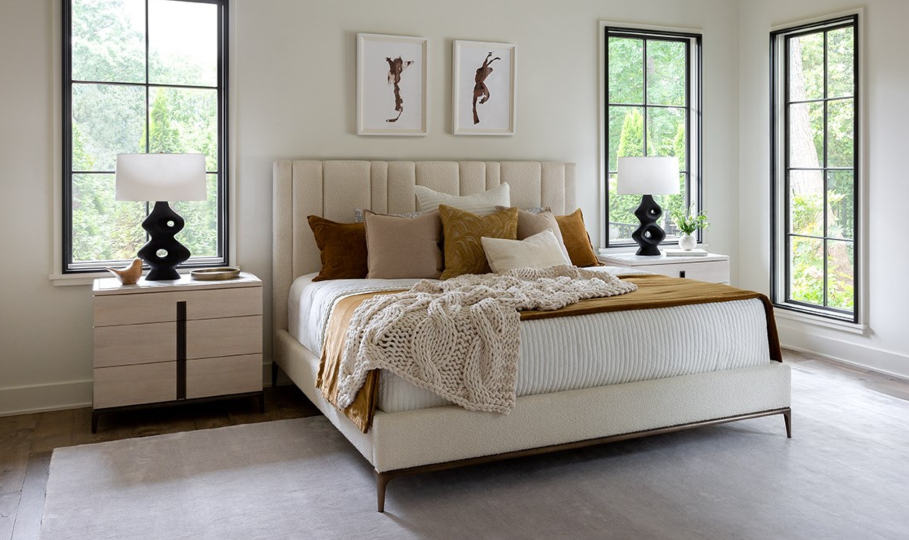 The Universal Furniture Erinn Maren Wooden Nightstand brings together natural materials and functional design in a refined bedside piece. An inset slab of white Calacatta marble anchors the nightstand’s surface, creating a subtle contrast against the soft Silver Lining finish of its white oak frame. The warm satin bronze hardware and metal base add depth without drawing attention away from the clean lines and balanced proportions.