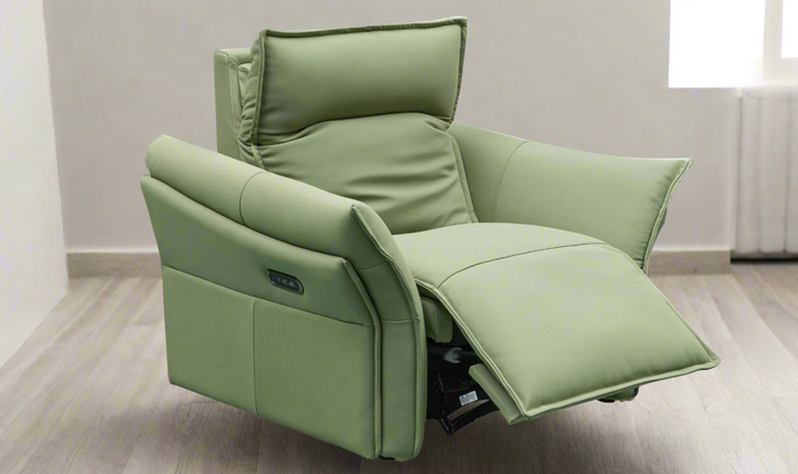 It boasts premium Stone Wash series leather upholstery and it's not just any color; it has a shade of hulk green and gives you vibes of mini hulk in your living room. And the deep stitching? It's like a fashion statement for your furniture. The down-filled cushions and soft foam padding are like sitting on a cloud—a cloud that also happens to be a recliner.