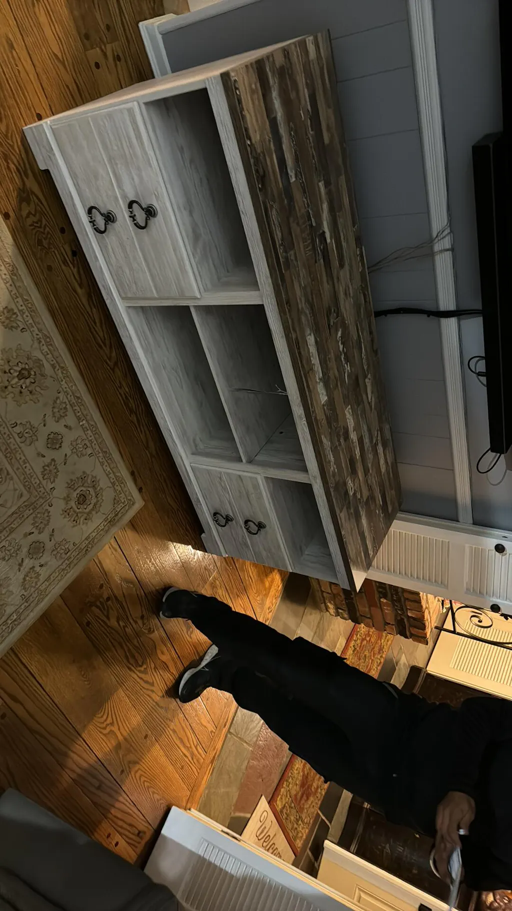 - 2 drawers, 2 media cubbies, cutouts for wire management and removable center shelf